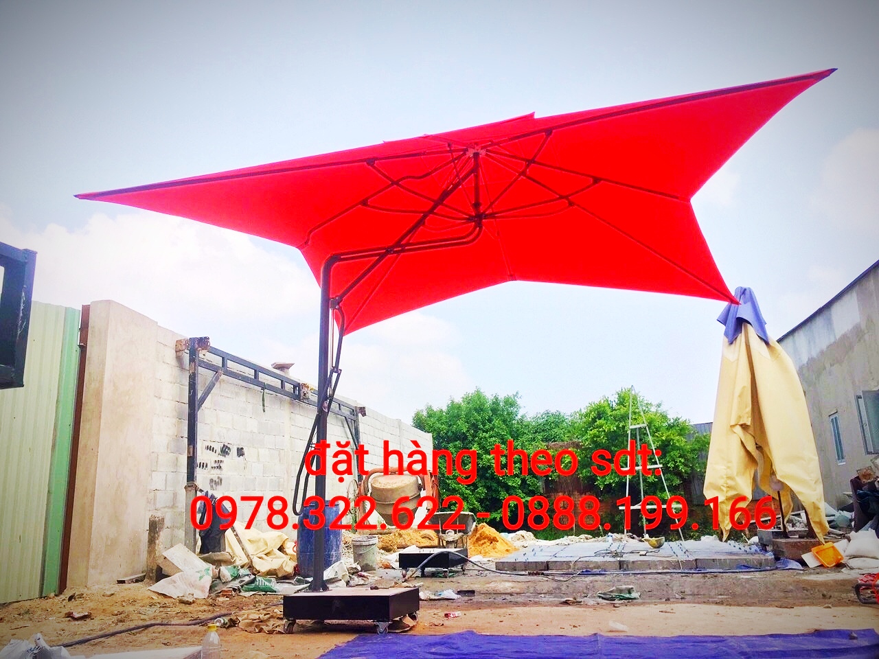 số mã vạch :8938532015044 : trụ hộp vuông 750 x 750 x 1,4mm – kèo đỡ vải 13 x 26 x 1,2mm – các chi tiết ốp CNC dày 4mm khung sơn tĩnh điện cao cấp – đường kính tán dù 3,5m chiều cao tính từ chân đế lên đỉnh dù 3,5m – chiều cao tính từ chân đế lên tán dù cạnh lớn nhất 2,5m – chân đế 750 x 750 x 150 hàn sắt bọc chung quanh chánh va đập đổ betong bên trong chải đá lên bề mặt mài phẳng, nặng 150kg – 200kg ( khách có thể đặt theo yêu cầu về độ dày của sắt, nặng hơn của chân đế )
